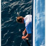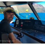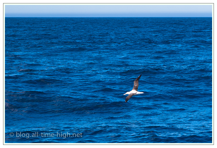 Nach dem obligatorischen Sicherheitsbriefing ging es in den Bus und wieder zum Hafen. Diesmal war das Schiff aber deutlich größer, wir waren 38 Personen und vier Besatzungsmitglieder. Die Schiffe von Whale Watch Kaikoura sind Spezialanfertigungen und mit einem Jetantrieb anstatt mit Schiffsschrauben ausgestattet. Das ermöglicht ihnen Geschwindigkeiten bis zu 30 Knoten (ca. 56 km/h) zu erreichen. Und, was noch beeindruckender ist: sie können aus voller Geschwindigkeit innerhalb einer Schiffslänge – das sind 18 Meter – zum Stehen kommen. Das ist auch der Grund, warum während der Fahrt alle sitzen mussten und erst zum Beobachten bei Langsamfahrt auf das Oberdeck und nach außen durften.
