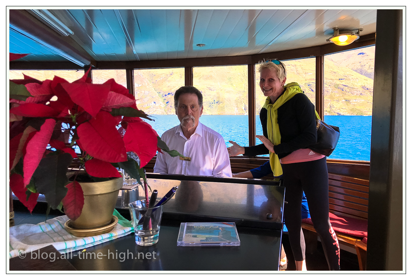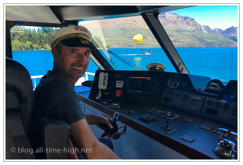 Aber das absolute Highlight war dann die Rückfahrt mit der TSS Earnslaw! Dieses Dampfschiff wurde 1912, im selben Jahr wie die Titanic(!), in Dunedin erbaut, dann zerlegt und am Südende des Lake Wakatipu, in Kingston, wieder zusammengesetzt, um auf dem See ihren Dienst zu tun. Der Doppelschraubendampfer (“Twin Screw Steamer” = TSS) wird auch Lady of the Lake genannt und verkehrt nun schon seit über 100 Jahren auf dem See.