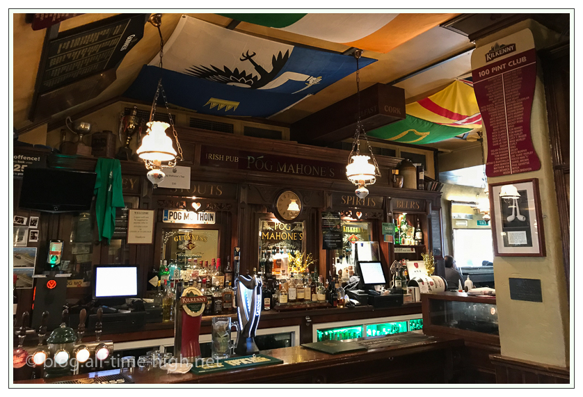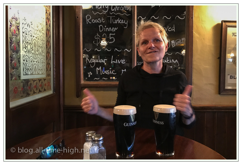 Nach dem Bier an Bord mussten wir zurück in Queenstown zunächst mal dringend eine gewisse Örtlichkeit aufsuchen. Da aber die öffentliche Toilette gerade wegen Reinigungsarbeiten nur zur Hälfte nutzbar war und dort schon eine Schlange von Leuten davor stand, wichen wir einfach in das nahegelegene Irish Pub Pog Mahone’s aus. Und wenn man dann schon mal da ist, gibt’s natürlich auch ein Guinness.