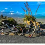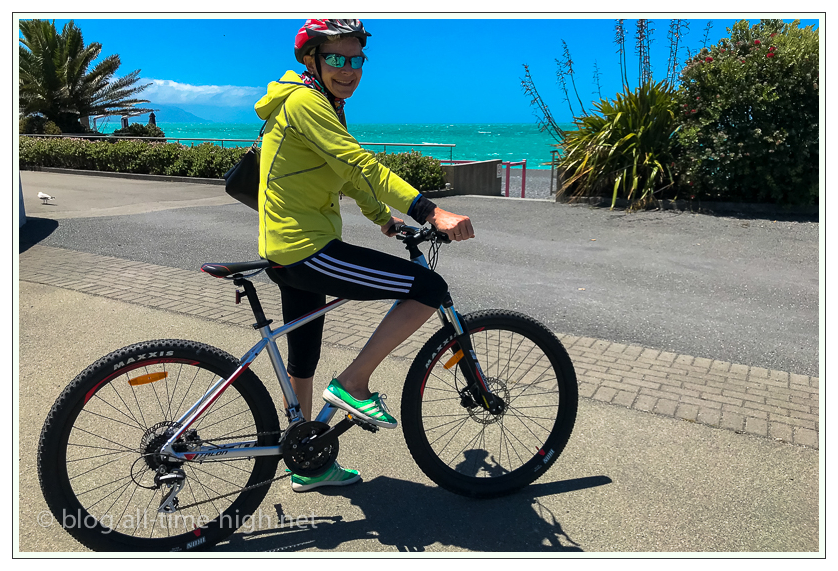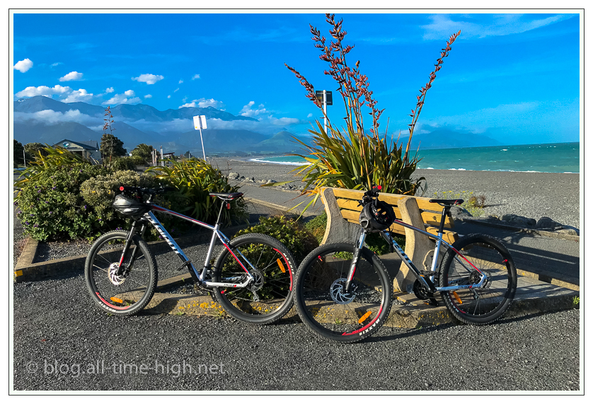 In der örtlichen iSite habe ich mir dann einen Fahrrad-Track beschreiben lassen, der rund um Kaikoura führt. Zum Start ging es Richtung Kaikoura Peninsula und den Berg hoch bis zum Aussichtspunkt. Von dort oben hatten wir einen tollen Blick auf die beiden Buchten von Kaikoura, auch wenn es sehr windig und diesig war. Der weitere Verlauf der Route führte uns auf schmalen Single-Tracks durch Wälder – in denen ein Vater mit seinen Jungs auf Motocross-Motorrädern rumdüste und Spaß hatte – und Buschwerk immer nahe des Highway 1, bis wir zum Kowhai River kamen. Von dort führte der Weg ein Stück ins Landesinnere, bevor wir dann parallel zur Küste wieder in Richtung Kaikoura radelten.