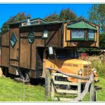 Kurz vor dem Ort fuhren wir an einem Farm Camp vorbei, wo wir sehr ausgefallene Behausungen entdeckten. So stand da zum Beispiel ein alter Eisenbahnwaggon als Wohnwagen und ein Lastwagen mit Holzhaus drauf, neben einer Jurte.