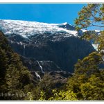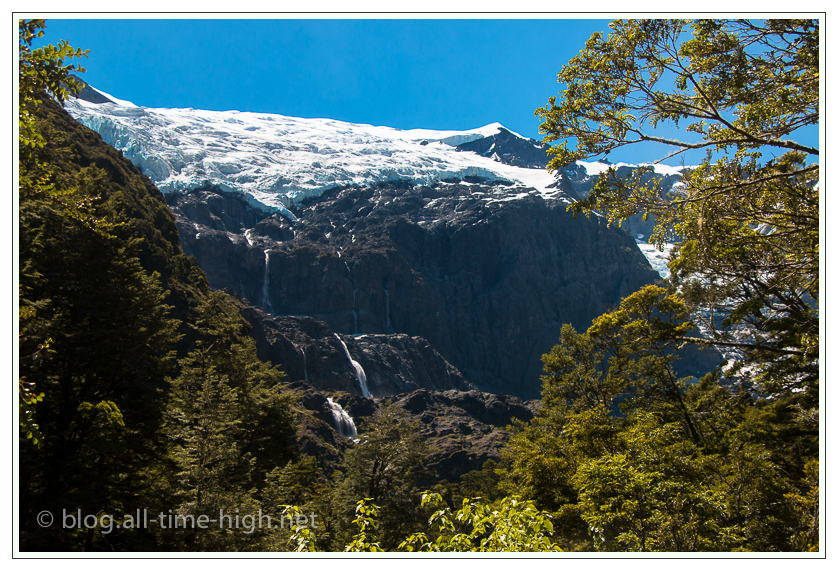 Immer höher stiegen wir oberhalb eines rauschenden Bachs durch den Regenwald und auf einmal tat sich zwischen den Bäumen eine Lücke auf und wir konnten zum ersten Mal einen Blick auf den Gletscher werfen. Sehr imposant erhob er sich da über unseren Köpfen.