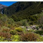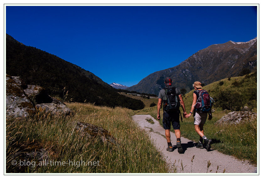 Am Carpark des Rob Roy Track angekommen, machten wir uns auch gleich auf den Weg. Zunächst führte der Pfad über Grasland, stieg dann jedoch ziemlich bald an und bog in das Tal zum Rob Roy Gletscher ein. Da bemerkte ich wieder einmal, dass es bei der Klassifizierung von Wanderwegen deutliche Unterschiede zwischen Deutschland und Neuseeland gibt.
