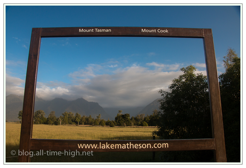 Zumal unsere Tagesetappe ohnehin auch ein ganzes Stück zu fahren war und wir am Abend den Lake Matheson besuchen wollten. Dort spiegeln sich bei gutem Wetter die Gipfel des Mount Cook und des Mount Tasman auf der Wasseroberfläche. Wir entschieden uns dann, nicht raufzugehen und statt dessen direkt an die Westküste zu fahren und dort dann ein bisschen früher anzukommen.