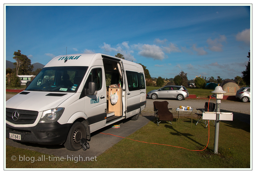 In Hanmer Springs waren im Männerbereich des Sanitärblocks nur zwei Toiletten und zwei Duschen, keine Ablagemöglichkeiten und außerdem war das ganze ziemlich kalt. Bei den Damen war es übrigens genauso, wie mir Claudia berichtete. In Franz Josef dagegen waren mindestens acht Duschen und Waschbecken mit Haken für Handtücher und Ablagen für Waschtasche, Zahnbürste, etc. vorhanden, dazu noch vier Pissoirs und acht Toiletten. Und das ganze in einem beheizten Gebäude. Man glaubt gar nicht, wie viel solche Kleinigkeiten dann doch ausmachen, vor allem, am Morgen.
