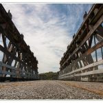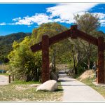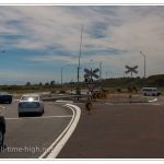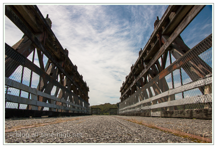 Dort gibt es einen Treetop Walkway, also einen Wanderweg zwischen den Baumwipfeln. Die Mittagspause genossen wir sozusagen in luftiger Höhe von 27 Metern über dem Boden zwischen den Bäumen. Der Blick von oben hat schon was. Auf der weiteren Strecke kamen wir bei Arahura an einen Kreisverkehr, der zusätzlich noch durch eine Bahnlinie durchkreuzt wurde. So was gibt es wohl auch nur in Neuseeland! Daneben steht die alte Eisenbahnbrücke als historisches Denkmal.