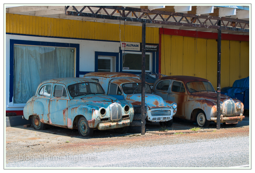 Immer weiter ging es die Westküste entlang in Richtung Norden, bis wir in Greymouth dann ins Landesinnere abbogen. Die Strecke führte uns über die alte Bergwerkssiedlung Dobson. Dort standen ein paar Oldtimer am Straßenrand, die ich unbedingt fotografieren wollte, leider in jämmerlichem Zustand. Claudia blieb derweil im Camper sitzen.