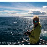 Als wir wieder zurück in der Basis waren, war es dann auch Zeit, noch schnell die nassen Klamotten in den Camper zu bringen und gleich weiterzuziehen zum Whale Watch. Und dort wartete nahezu das gleiche Spiel auf uns: als wir ankamen, standen vor uns schon drei Leute von der Warteliste, die auch mit auf die Tour wollten. Und wieder sank Claudias Miene und Mut. Aber auch hier hatten wir Glück, denn wir waren die ersten auf der Liste, da wir uns bereits am Vortag eingeschrieben hatten.