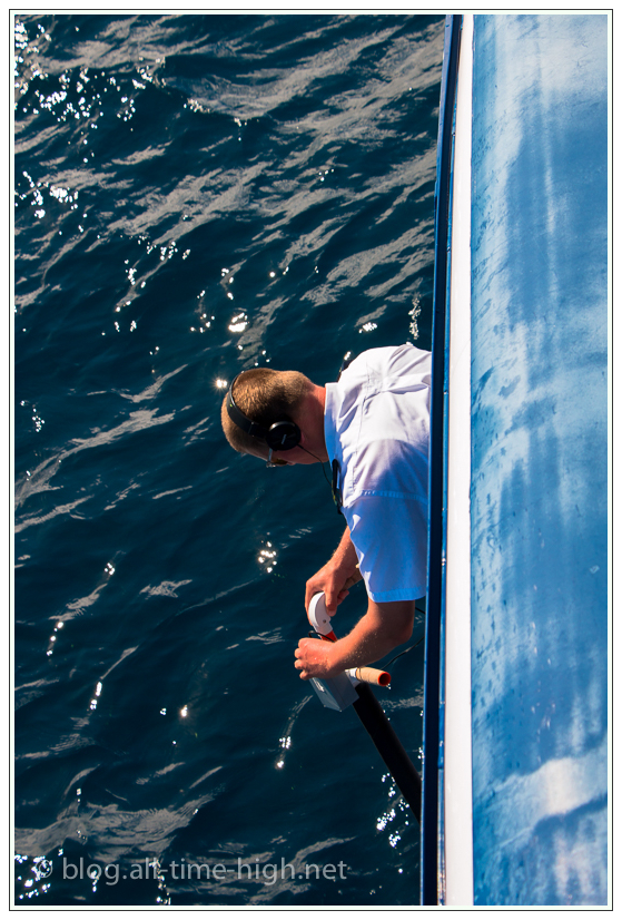 Es dauerte nicht lange, bis wir den ersten Wal sahen. Ein Finnwalpaar kreuzte unseren Weg. Ein paar Mal konnten wir aus nächster Nähe die senkrechte Fontäne und den mächtigen Buckel sehen. Der Finnwal bläst übrigens senkrecht und der Pottwal, der auf englisch ‚Sperm Whale‘ heißt, stößt sie im 45° Winkel aus. Leider blieb die Suche nach einem Pottwal erfolglos, das Echo lieferte keine Geräusche dort, wo sie auf der vorherigen Tour noch gesichtet wurden.