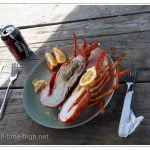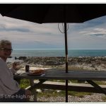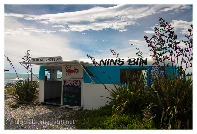 Allerdings nicht lange, denn ca. 25 km hinter Kaikoura sahen wir am rechten Straßenrand das Hinweisschild zu ‚Nin’s Bin‘, einem Imbissstand, der auf Fisch und Krustentiere spezialisiert ist und uns von Hadley auf der Whale Watch Tour empfohlen wurde. Die Qualität sei ausgesprochen gut und die Preise um die Hälfte niedriger als in den Lokalen in Kaikoura. Angehalten, reingegangen und Nin zeigte uns sofort, was sie heute fangfrisch anzubieten hatte: Langusten, Fish & Chips und Muscheln.