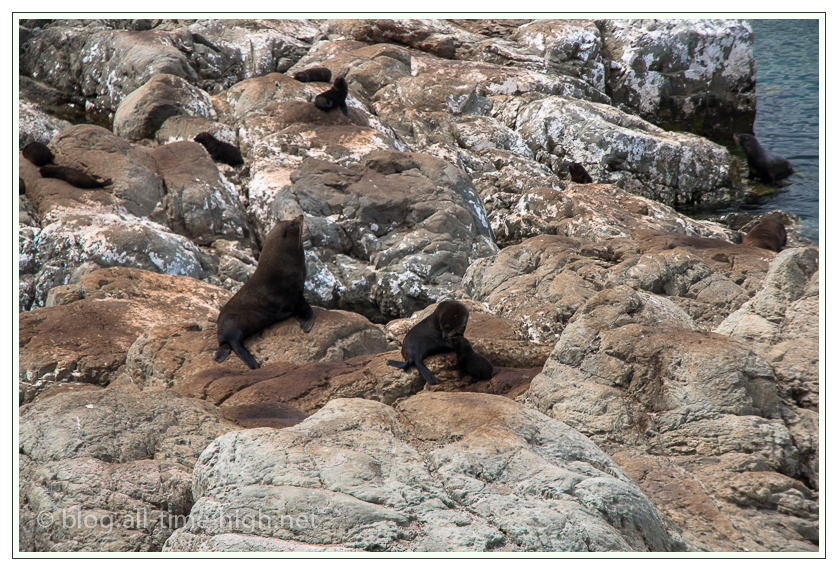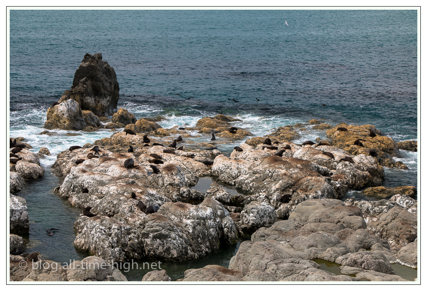 Auf der weiteren Strecke konnten wir deutlich noch die Auswirkungen des letzten Erdbebens vom November 2016 sehen, die Straße war zum Teil schon fertig erneuert, zum Teil noch sehr in Mitleidenschaft gezogen. So zum Beispiel am Ohau Stream, wo sich im Frühjahr in einem Naturbecken eines kleinen Baches die jungen Seals zum Spielen einfanden (der Link zeigt ein Video vor der Zerstörung). Der durch das Erdbeben ausgelöste Erdrutsch hatte das Becken leider zerstört. Auf den Felsen am Strand lagen dafür unzählige der pelzigen Gesellen und sonnten sich oder tollten im Wasser herum. Einfach faszinierend zu beobachten und es fiel uns schwer, wieder weiterzufahren.