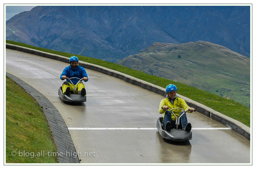 Die Luge war ziemlich witzig, auch wenn auf der ersten von drei Fahrten der Hintern etwas nass wurde, da es ein bisschen geregnet hat. Dem Spaß an der Sache hat es aber keinen Abbruch getan und auf der Strecke war es dann sogar ein bisschen kniffliger, denn im Nassen sind die Dinger in den Kurven schon mal ausgebrochen. Es gibt zwei verschiedene Routen und die erste Fahrt MUSS auf dem sogenannten “Scenic Track” stattfinden, damit man sich an die Dinger gewöhnt, erst dann darf man auf den “Advanced Track” – der natürlich viel cooler und schneller ist.