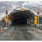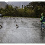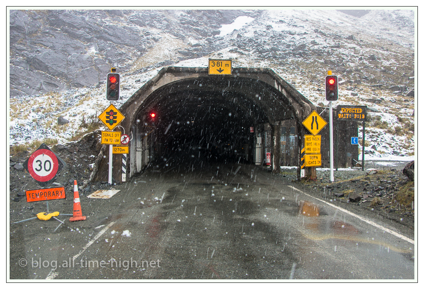 Vor dem Tunnel mussten wir kurz warten – da er einspurig ist, gibt es hier eine Ampelregelung, bei der sogar angezeigt wird, wie lange die Wartezeit noch ist – und das gab uns Gelegenheit, einen Blick auf einen Bus zu werfen, der wohl gerade vom Sound gekommen ist: lauter Asiaten, die sich wie bekloppt bemühten, einen der herumspazierenden Keas irgendwie fotogen vor die Linse zu bekommen. Klappte aber scheinbar nicht wie gewünscht, denn eine hat der anderen immer wieder das Objekt vor der Linse weggescheucht. Wir hatten Spaß.
