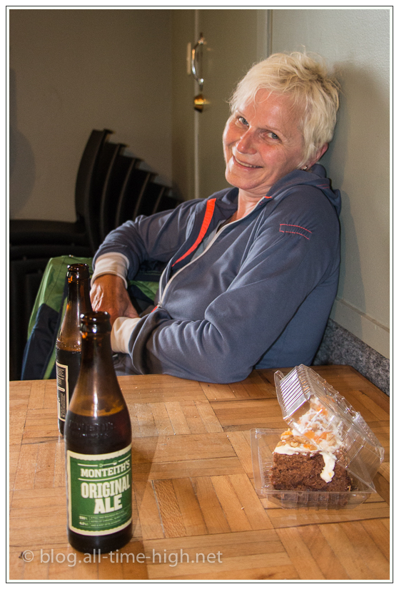 Schnell den Camper geholt und dann das Ankommerbier – okay, es waren drei kleine 0,33l Flaschen, genossen. Claudia hatte ihr bevorzugtes Monteith Black, ich hatte mein Monteith Original Ale. Nachdem wir allen möglichen Leuten beim Zubereiten ihrer verschiedenen Speisen zugesehen hatten packte uns auch der Hunger. Aber da wir für heute Abend nur einen Asia-Nudelsnack aus dem Becher auf dem Programm hatten – wir haben zu Mittag in Te Anau ausgiebig gespeist – verzichteten wir darauf, die ganzen engagierten Hobbyköche in der Gemeinschaftsküche mit unseren Instant-Suppen-Bechern vor den Kopf zu stoßen und aßen im Camper.