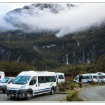 Die Nacht über hat es immer wieder mal ziemlich geregnet und so war es auch noch, als wir aufwachten. Zum Glück jedoch hörte das Geprassel dann ziemlich rasch auch wieder auf, als wir einigermaßen soweit waren, dass wir die Waschräume aufsuchen konnten – wenn es warme Duschen und Toiletten umsonst gibt, nutzen wir die natürlich auch und sparen so unser eigenes Wasser und die Chemietoilette im Camper. Dafür hat es dann später wieder zu regnen begonnen und durchgehalten, bis wir am Milford Sound ankamen – nur unterbrochen von Schnee in den höheren Lagen.