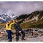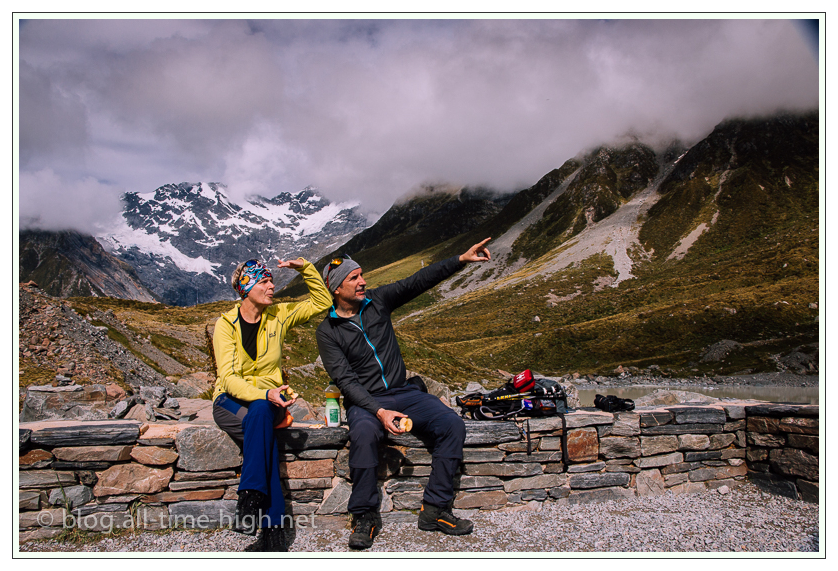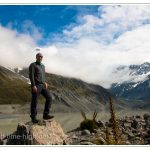 Wir frühstückten erst mal gemütlich und machten uns dann auf den Weg zu unserer ersten Wanderung: dem Hooker Valley Track. Diese Wanderung führt vom Campground zum Hooker Lake direkt unterhalb des Mount Cook. Dafür rechnet man mit ca. drei Stunden für den Hin- und Rückweg von insgesamt 10km. Und wir hatten richtiges Glück: je näher wir dem Hooker Lake kamen, desto mehr lichtete sich der Nebel und der Mount Cook kam zum Vorschein. Am Ende war er fast ganz zu sehen.