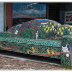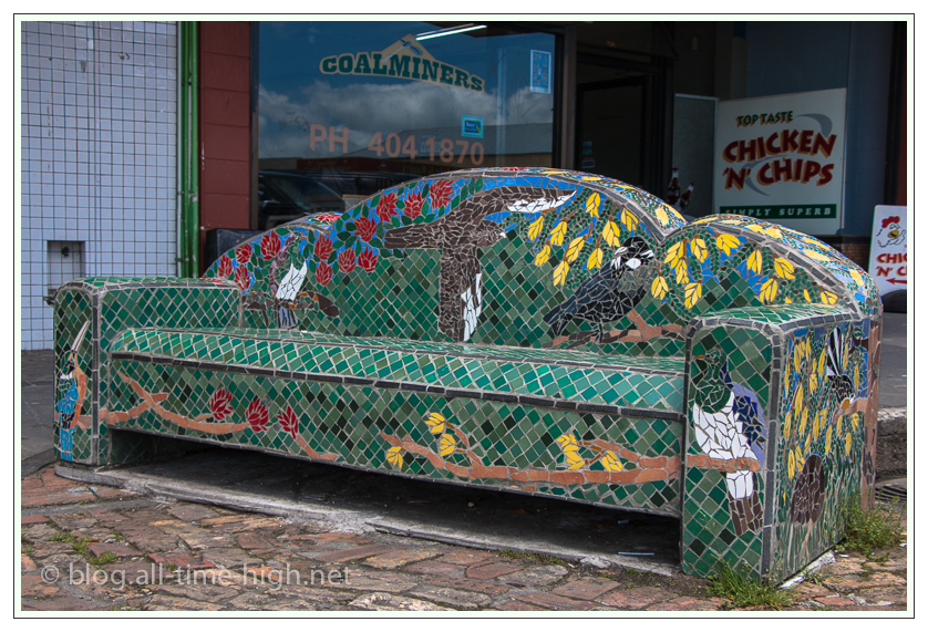 Der ganz Ort hat sich dann an diese Art von Kunst drangehängt und so findet man an jeder Ecke irgend etwas, das entfernt nach Hundertwasser aussieht. Wir haben uns die steinerne Bank gegenüber der Toilette ausgesucht, um dort unseren kurzfristig mitgenommenen Chinese Takeaway zu verspeisen. Ganz schön banal, aber es hat geschmeckt. Die andere Straßenseite ist ja auch weit genug von der Toilette weg, man sieht sie nur, man riecht nix, keine Angst. Auch die Installation “Amazespace” gehört zu den Trittbrettfahrern des Hundertwasser-Sch…hauses, ist aber eigentlich ganz witzig gemacht, auch wenn wegen eines Erdrutsches nur ein ganz kleiner Teil geöffnet war.