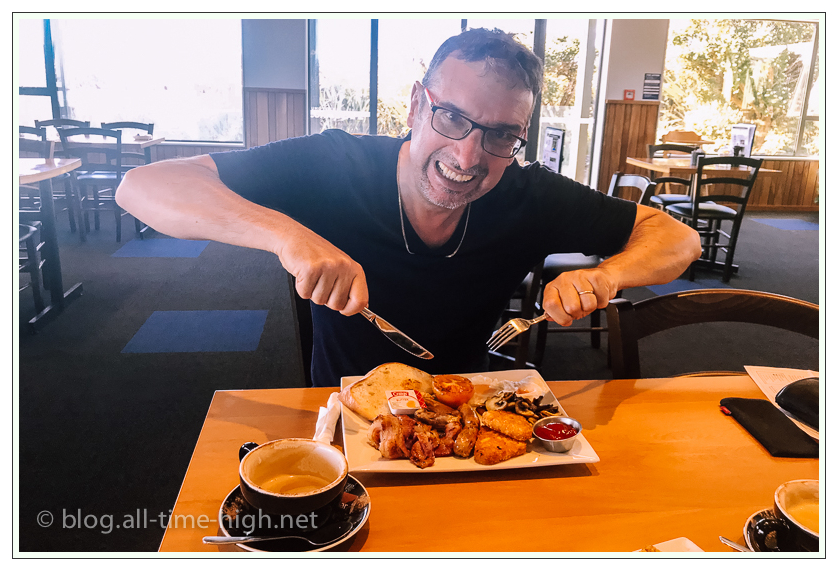 Vor dem Frühstück im Camprestaurant – dieses Mal ließen wir es richtig krachen – telefonierte ich noch mit dem Camperverleih, um die Sache mit unserer Stromversorgung bzw. der Standheizung zu klären. Nach kurzer Zeit bekam ich eine Adresse in Invercargill genannt, zu der wir fahren sollten. Die Leute dort wissen Bescheid und warten auf uns, egal, wann wir kommen.