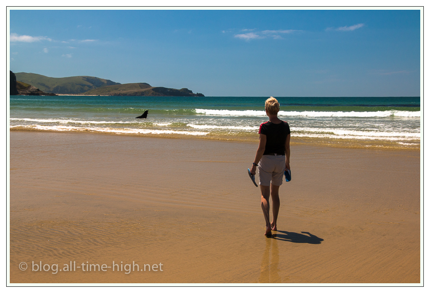 Das Camp liegt direkt an der Porpoise Bay, dort konnte Claudia ein Rudel Hector Delfine beobachten, die sich um ein Kayak tummelten. Sowohl die Delphine als auch die beiden Leute im Kayak hatten sichtlich Spaß. Leider waren sie zu weit weg, um ein vernünftiges Foto zu machen. Aber mit unserem Fernglas konnte man das Treiben gut beobachten.
