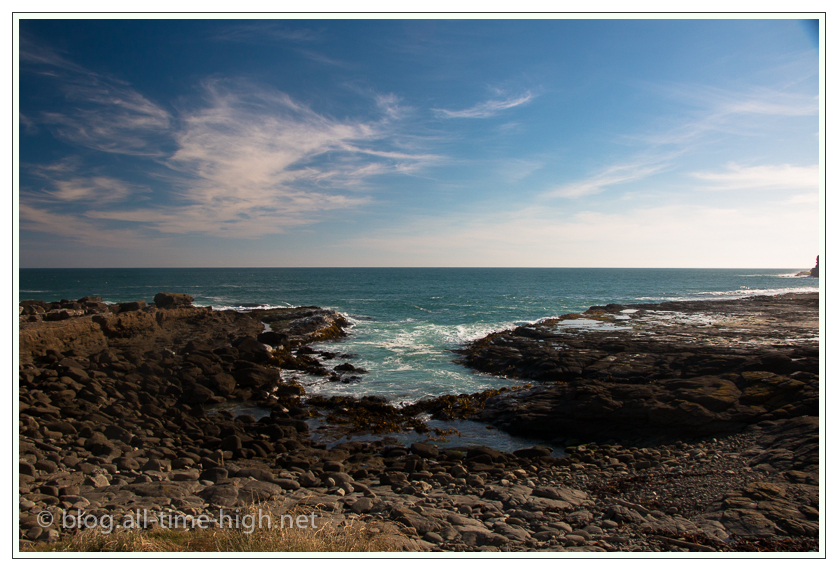 Wenn die Brandung ihre Wellen in den Kanal drückt, wird das Wasser durch die Höhlenwände, wie in einem Trichter, zum Blowhole geführt. Dies führt bei den richtigen Wetterbedingungen zu spektakulären Wasserfontänen. Wir hatten aber nicht die richtigen Bedingungen und haben nur das große Loch im Boden gesehen. Aber auf dem Track gab es dennoch einige schöne Aussichten.