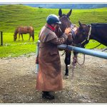 Nachdem sie noch unsere Namen, Größen und Gewichte durchgegeben hat, machten wir uns auch schon auf den Weg. In neun Minuten waren wir da! Und wir waren nicht die letzten, denn Martin, der Fahrer des Busses, der uns zum Startpunkt bringen sollte, war noch nicht da. So konnten wir uns in Ruhe einkleiden, was bedeutete, wir bekamen einen Helm und einen Western-Staubmantel, da es immer wieder leicht regnete.