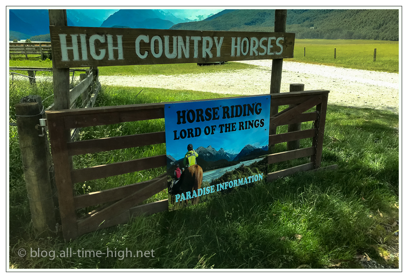 Und so fragten wir Grace an der Rezeption vom Camp Glenorchy (heute “The Headwaters Eco Lodge”), ob sie für uns eine solche Tour buchen könnte. Sie fragte uns, ob wir einen bestimmten Anbieter hätten und wir meinten, wir hätten Infos von High Country Horses gelesen. Grace griff sich das Telefon und begann zu telefonieren. ‘Um halb drei geht eine Tour los, die letzte für heute’, meinte sie. Es war zehn nach zwei! Wir fragten, ob wir das schaffen können. Sie meinte: ‘Es sind nur zehn Minuten Fahrt bis zum Check-In, das geht schon!’