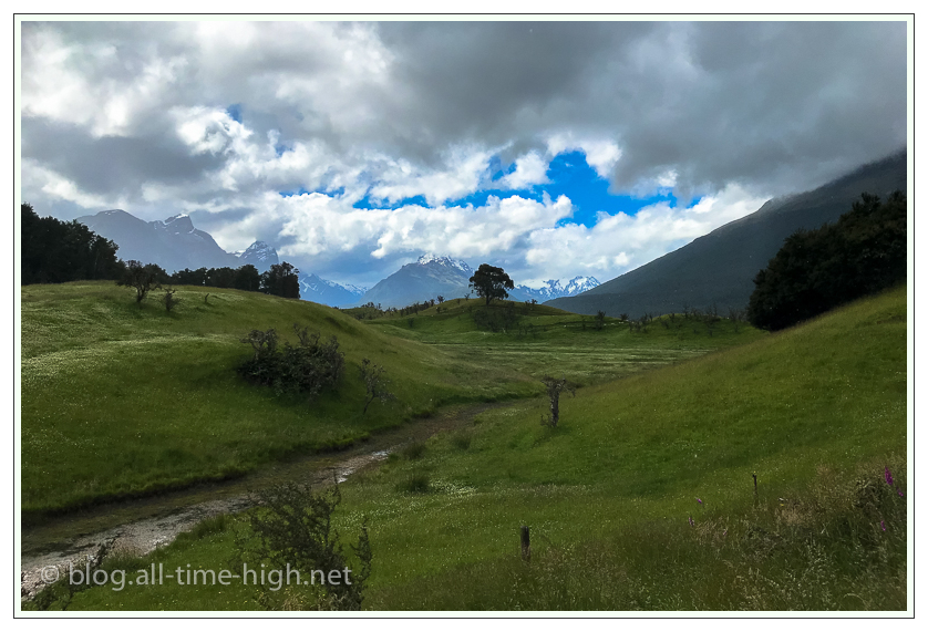 Die Straße zwischen Queenstown und Glenorchy führt am Lake Wakatipu entlang und ist alleine schon eine Reise wert. Vergleichbar vielleicht mit der Straße am Westufer des Gardasees. Begleitet von den unvermeidbaren Regenschauern fuhren wir unserem Ziel entgegen und wie bestellt kam kurz vor Glenorchy die Sonne raus und schien für uns auf den letzten Kilometern.