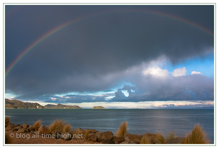 Zum perfekten Abschluss des Tagen gab es, da dann doch noch ein paar Regentropfen gefallen sind, einen hammermäßigen doppelten Regenbogen über der Bucht von Marahau.