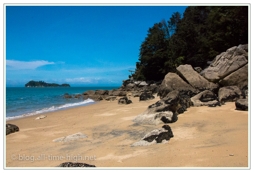 Das Wassertaxi brachte uns dann in die Torrent Bay, von wo wir unsere Wanderung auf dem Abel Tasman Track starteten. Zwei Stunden und zehn Minuten stand auf den Wegweisern zu unserem Ziel Bark Bay. Inklusive Überschreitung der Falls River Hängebrücke, die ganz schön wackelte.