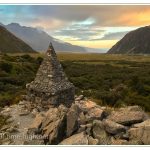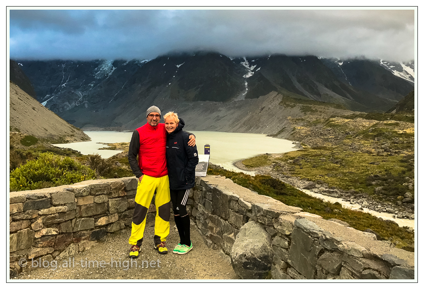 Nachdem wir noch das organisatorische erledigt hatten – dafür war vor dem Flug ja keine Zeit mehr – machten wir uns auf den Weg weiter taleinwärts bis zum White Horse Hill Campground. Dort stellten wir den Camper ab und gingen auf dem Wanderweg in Richtung Hooker Valley bis zum Denkmal für die Verunglückten in diesen Bergen. Und wir genossen nochmal einen tollen Blick auf den Mount Cook.