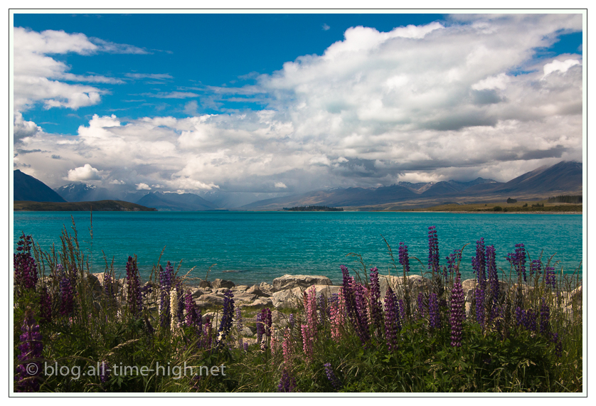 Auf dem Weg zu Lake Tekapo kamen wir an großen Feldern mit Lupinen vorbei, die hier einfach wild wachsen. Das mussten wir natürlich fotografieren. Wir waren nicht die einzigen, die diese Idee hatten und so tummelten sich eine Masse Menschen mitten in den zum Teil brusthohen Blumen. Ach ja, und natürlich schien jetzt, wie versprochen, die Sonne.