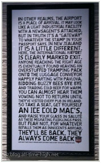 Am Tag zuvor – naja, eigentlich war es ja erst heute, weil wir ja immer noch den 16. November haben (die Datumsgrenze, ihr wisst ja) – haben wir uns von Neuseeland verabschiedet. Und auch am Flughafen in Auckland gab es eine Mac’s Brewbar, in der wir unser letztes Mittagessen in Neuseeland (zumindest in 2014) verspeist haben. Gut beschützt von einer riesengroßen Zwergenstatue und mit der Gewissheit, dass wir wiederkommen werden – das stand ja auch groß so auf der Tafel, als wir das Abflugterminal betreten haben, stiegen wir in unseren Flieger nach Rarotonga.